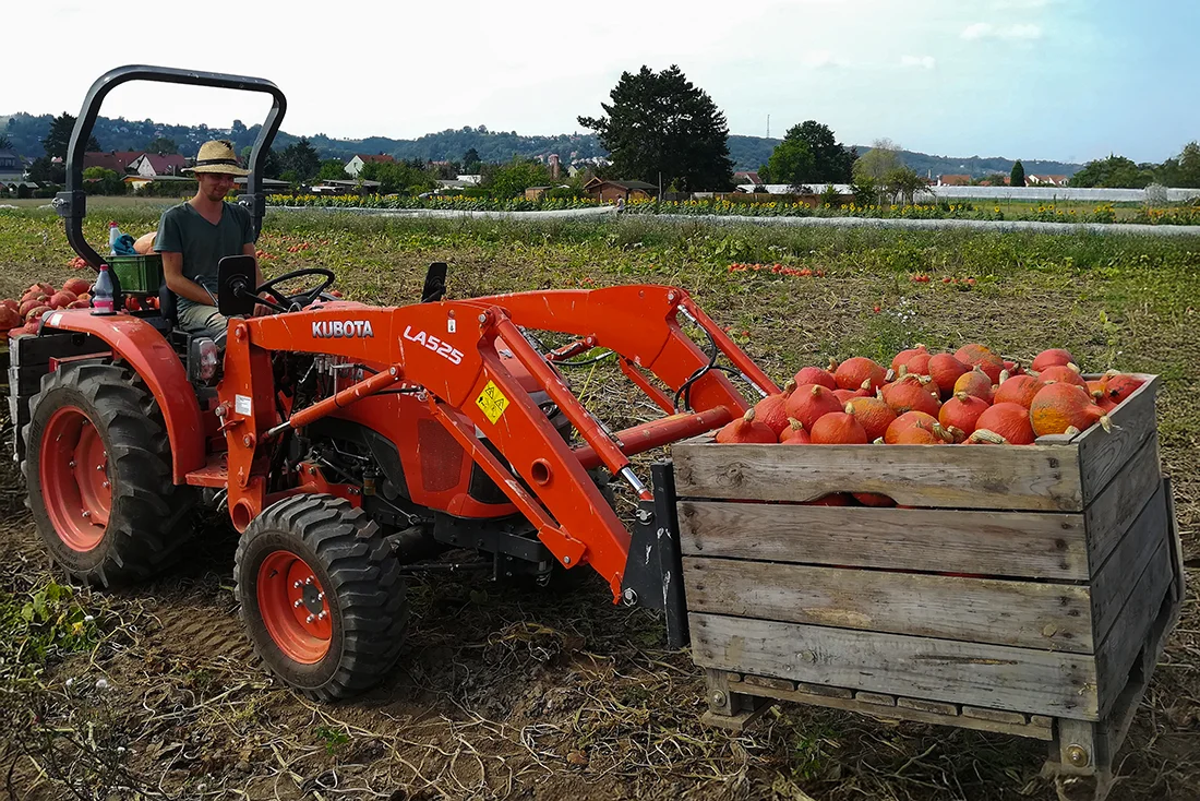 - Einen Kubota-Kleintraktor verwenden wir für die Bodenbearbeitung in den Folientunneln sowie den Transport.