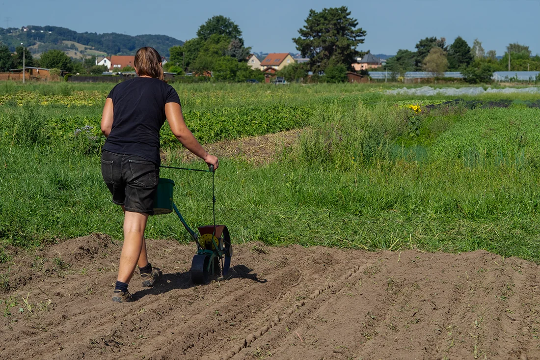 - Zum Säen unserer Kulturen nutzen wir je nach Fläche ein Anbaugerät, das wir am Traktor befestigen, oder eine Handsämaschine zum Schieben.